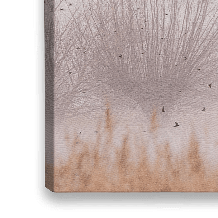 Koop dit vogel kunstwerk knotwilgen met vogels in de mist, van natascha verbij op canvas, aluminium dibond, (ingelijste) fotoprint, behang en ArtFrame, op maat geprint in Fine-Art kwaliteit.