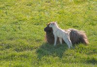 weiland met mama schaap en haar lammetje, waarbij het lammetje dicht bij mama staat en lijkt te zeggen : 'ik hou van je, mama'