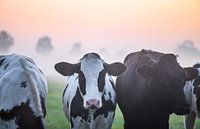 close up van enkele koeien in het weiland, in de vroege ochtend, met grondmist, en waar de lucht oranje kleurt door de bijna opkomende zon