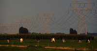 landschap met koeien en electriciteitsmasten gekleurd door de ondergaande zon