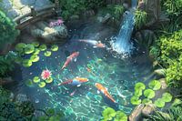 Digitaal kleurrijk beeld van Koi karpers in een japanse vijver met helder water