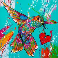 Kleurrijke kolibrie met een rood hart in zijn snavel.
