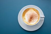 kopje cappuccino met cacaopoeder op een blauwe achtergrond, uitzicht direct van bovenaf, kopieerruimte, geselecteerde focus, zeer smalle scherptediepte