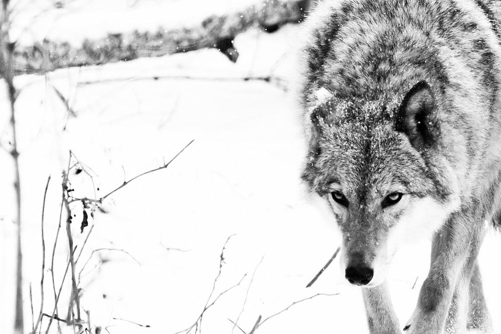 koud bos... beestachtige jacht prooi snuift. Grijze wolf vrouwtje in de sneeuw, mooi sterk dier in de winter. zwart-wit minimalistisch.