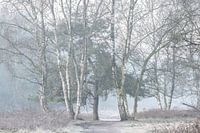 een aantal bomen op de heide, in een wit landschap door de vorst van de vroege ochtend, en de mist in de achtergrond
