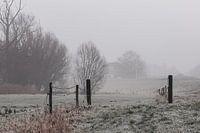 een winterlandschap langs de Rijn in Driel, waar het zicht beperkt is door de dikke mist, en het gras wit door de vorst