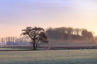 landschap in Homoet, Gelderland, waar de rijp over het weiland zit, en de opkomende zon de lucht prachtig kleurt