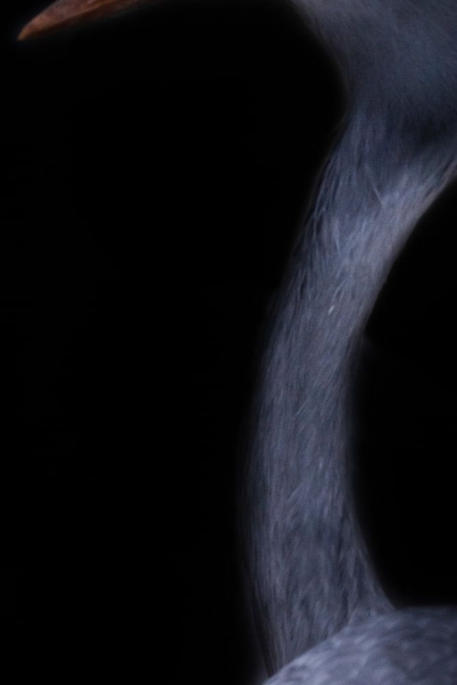 kraanvogel sierlijke vogel close-up, dunne lange nek, mooie kop op een wazige achtergrond de tweede vogel. Donkere, zwarte achtergrond