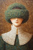 krans hoed - Een speelse wintermysterie — je ziet eerst de krans, en dan pas het gezicht. Dit schilderij voelt als een verrassing onder de kerstboom: een weelderige groene krans die als een dikke, donzige muts laag over de ogen hangt, met kleine gouden bolletjes als kerstornamentjes erin gedrapeerd. De krans-hoed dekt het bovenste deel van het gezicht af en onthult alleen een zachte neus en een vriendelijk glimlachende mond; precies genoeg om nieuwsgierigheid op te wekken en tegelijk warmte te geven. Het is een kerstsprookje zonder clichés, een surrealistisch kerst portret waar het winterselement direct in het hoofdmotief zit.