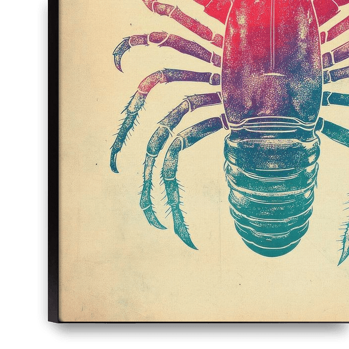 Dit grafische stencil art kunstwerk presenteert een krachtige en opvallende compositie, gecentreerd rond het silhouet van een kreeft. De strakke vormgeving combineert minimalisme met een levendige parelmoer kleurenpalet, wat resulteert in een visueel prikkelend stuk.