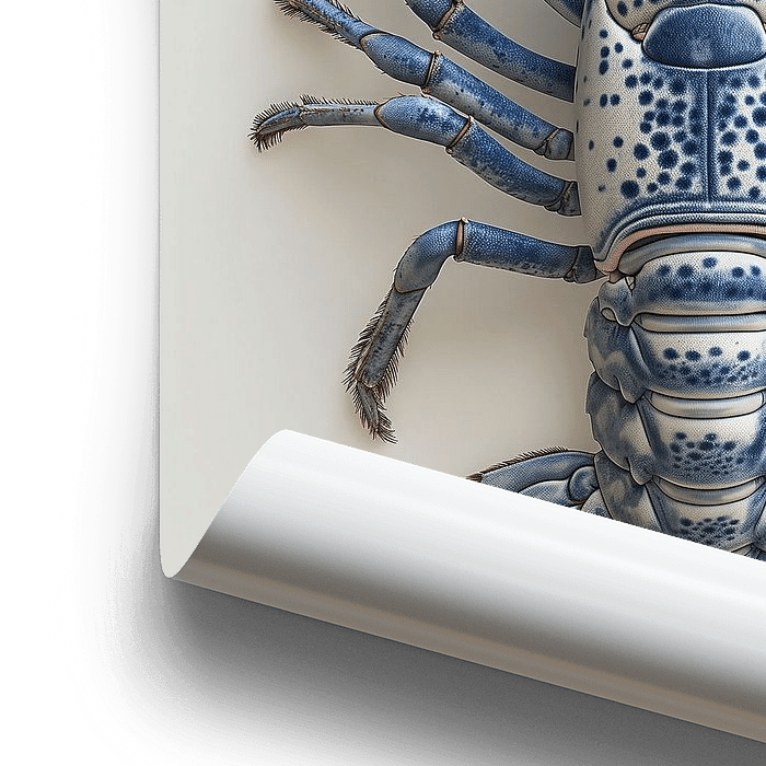 AI gegenereerd beeld van een kreeft met typisch delfts blauw gekleurd pantser tegen een witte lichte achtergrond