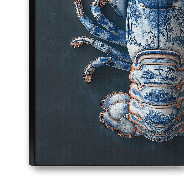 AI gegenereerd beeld van een kreeft met typisch delfts blauw gekleurd pantser tegen een luxe donkere achtergrond
