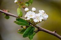 Een frisse krentenbloesem gefotografeerd met een mooie bokeh. Het voorjaar druipt er van af!