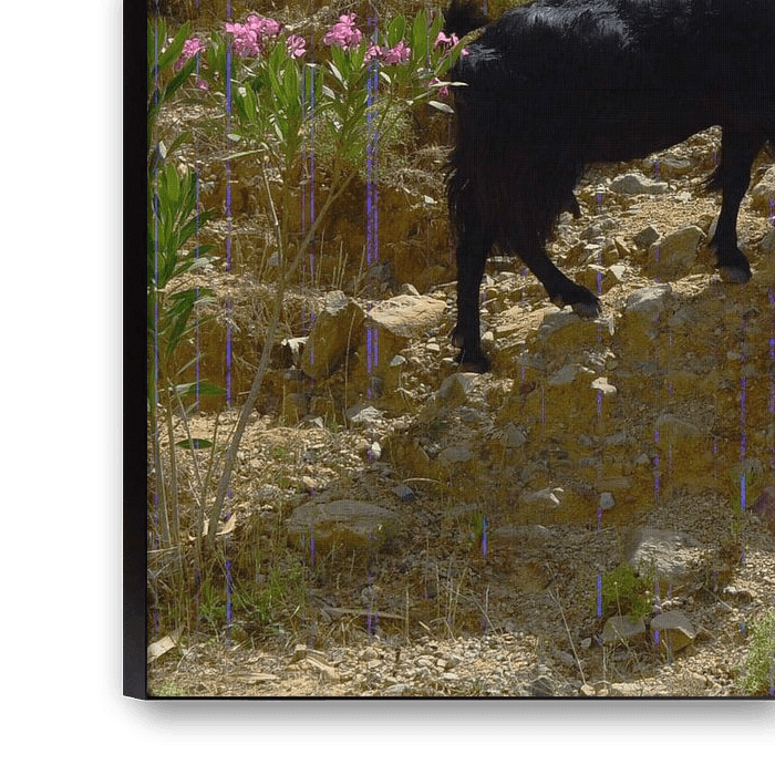 De compositie vangt de natuurlijke schoonheid van het landschap, waarbij de kleuren elkaar versterken en een rustgevende maar tegelijkertijd warme uitstraling geven. Het lichte zand, de zachte bloemtonen en de aardetinten van de geiten creëren een helder en evenwichtig beeld, perfect voor liefhebbers van natuurfotografie en zonnige landschappen.