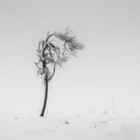minimalistische zwart-wit landschap van een gebogen boom in de sneeuw en de mist op de Noir Flohay in de Hoge Venen in Oost België