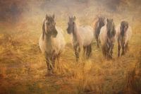 Een kudde konikpaarden een schilderij vanuit het duin. In de uitgestrekte duinen van Nederland, een gebied van rust en natuurlijke pracht, vinden we de elegante konikpaarden. Met hun wilde manen wapperend in de wind, doorkruisen ze gracieus de glooiende landschappen. Deze oerpaarden, met hun sterke band met de omgeving, zijn meer dan alleen grazers. Ze zijn hoeders van het ecosysteem, helpen bij het onderhouden van de vegetatie en dragen bij aan het behoud van biodiversiteit. Als symbolen van vrijheid en wildernis, voegen ze een vleugje mystiek toe aan de Hollandse duinen. Voor wandelaars en natuurliefhebbers vormen ontmoetingen met deze majestueuze dieren vaak onvergetelijke momenten, waarin de verbondenheid tussen mens en natuur opnieuw wordt bevestigd. De konikpaarden in de Hollandse duinen zijn niet alleen bewoners van het landschap, maar ook bewakers van zijn integriteit en schoonheid.