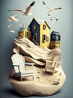 Het tafereel toont een idyllisch kustlandschap in gestileerde vorm, waarin kleurrijke huizen in geel en blauwgrijs op een glooiende zandheuvel staan. Twee witte houten ligstoelen nodigen uit om te blijven zitten. Talrijke gestileerde meeuwen omcirkelen het landschap en geven het een levendige dynamiek. Een klein, donker vogeltje pikt in het zand. De zachte, organische vormen van het zand contrasteren met de heldere lijnen van de architectuur en de ligstoelen, waardoor een harmonieuze en vredige sfeer ontstaat.