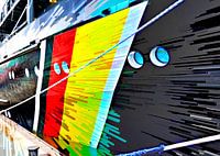 Romp van een met de nationale kleuren beschilderde kustwachtboot, gelegen aan de kade in Hamburg, Duitsland.