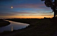 De maan wordt weerspiegeld in het water op de voorgrond.