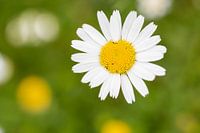 Een foto die goed humeur verspreidt, als een moment vol lichtheid. In het midden van het groen straalt een madeliefje naar de zon, stralend wit, vol leven. Frisse, levendige kleuren, helder en helder, vol positieve energie.