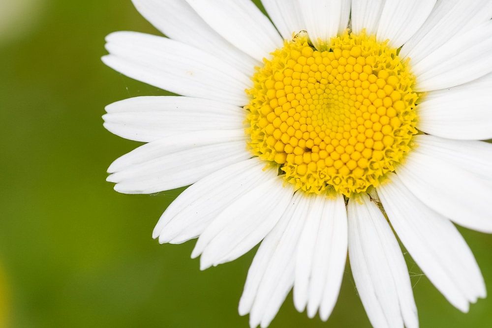 Een foto die goed humeur verspreidt, als een moment vol lichtheid. In het midden van het groen straalt een madeliefje naar de zon, stralend wit, vol leven. Frisse, levendige kleuren, helder en helder, vol positieve energie.