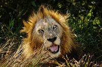 Prachtige mannetjesleeuw in het Kruger National Park, Zuid-Afrika steekt zijn tong uit.