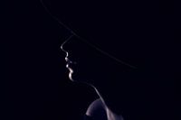 Foto gemaakt in mijn studio met minimaal licht waardoor alleen de contouren van het gezicht en de rand van de hoed zichtbaar zijn.
