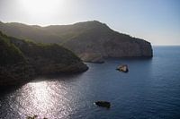 Mooi beeld van de kust van ibiza met de zon al stralend over de bergen reflecterend in de zee.