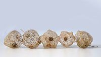 macrofoto van 5 gedroogde bloemen van de lampionplant, ook wel bekend als Physalis alkekengi, tegen een witte achtergrond