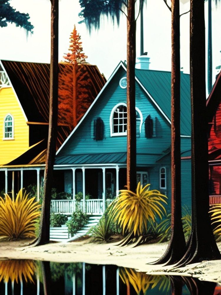 Een vredige foto van de waterkant toont een rij kleurrijke huizen in geel, blauw en rood die zich uitstrekt langs een kalm waterlichaam. Slanke, donkere bomen met een weelderig, groen bladerdak omzomen de oever en worden schilderachtig weerspiegeld in het heldere water. De huizen zijn ontworpen in een eenvoudige landhuisstijl, elk met een eigen kleuraccent en veranda. De zachte weerspiegelingen in het water versterken de rustige sfeer van het tafereel. Het kleurenpalet is levendig maar harmonieus en de heldere lucht wijst op een zonnige dag. Een idyllische voorstelling van ontspanning aan het water.