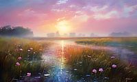 Eens, in een betoverend land ver weg, strekte zich een schilderachtig landschap uit onder een zachtroze hemel. Het glooiende heuvellandschap was bezaaid met velden vol bloeiende bloemen in pasteltinten. Een zacht briesje wiegde de bloemen heen en weer, waardoor de kleuren leken te dansen als een levend schilderij.
