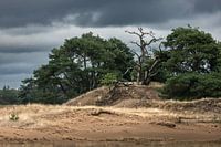 Deze foto is gemaakt op de hoge veluwe. In de dode boom zit ook nog een roofvogel. De dreigende luchten en de zon die nog op het zand schijnt, maken de foto tot een prachtig beeld.
