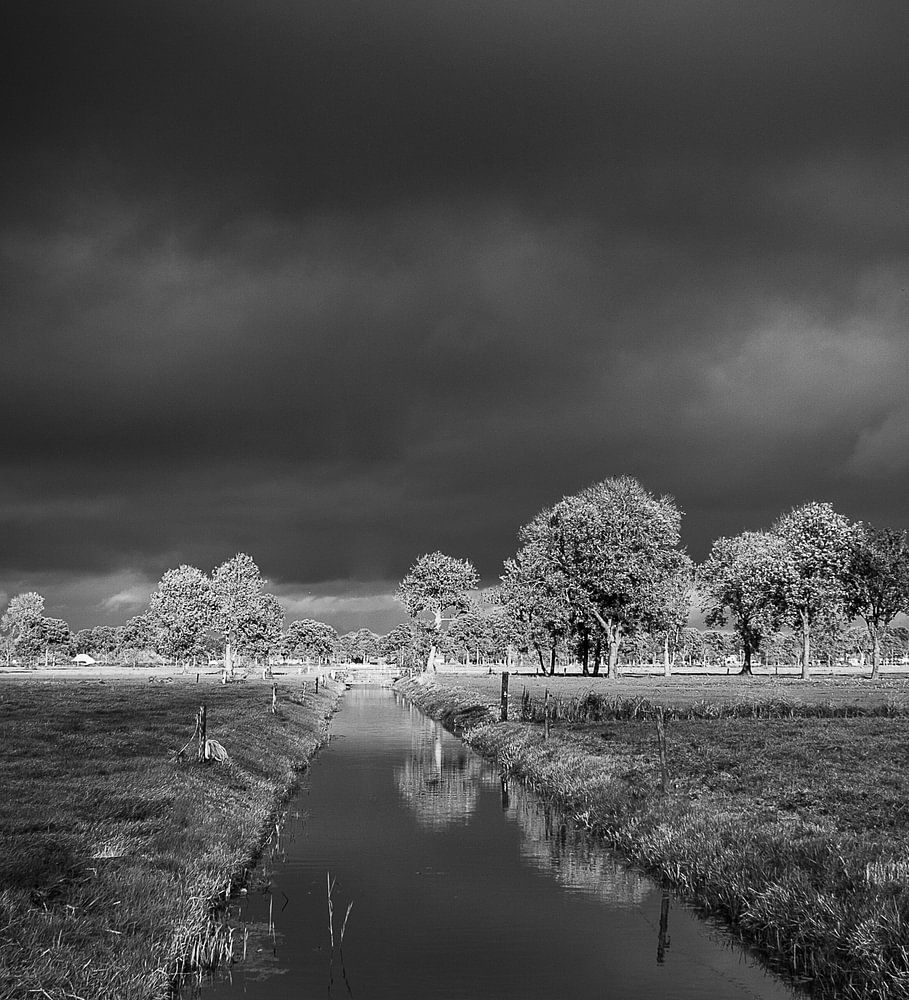 Een mooi landschap in de Kop van Overijssel met een dreigende lucht op de achtergrond en de zon die net even een deel van het landschap belicht