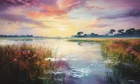 De zon begon langzaam onder te gaan, schilderend met haar laatste stralen een warm palet van oranje en roze over de horizon. De lucht vulde zich met een magische gloed, terwijl de eerste sterren aan de hemel verschenen. Het landschapje met zachte kleuren werd stiller, maar de betovering bleef hangen, als een herinnering aan de schoonheid van de wereld in haar meest delicate tinten. En zo vervolgde het betoverende landschap zijn eindeloze dans met de tijd, onder de deken van een rustige nacht.