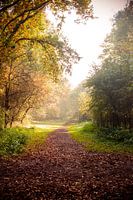lang bospad bedekt met herfstbladeren in het zonlicht