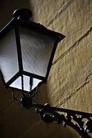 Strijklicht valt over een muur in een stad in het noorden van Spanje en laat de lantaarn eruit springen.