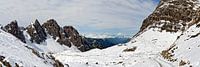 De Laserzkessel in de Lienzer Dolomieten met Gamswiesenspitzen en Bloßkofel na een nachtelijke sneeuwval, Tirol, Oostenrijk;
