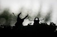 twee vliegende herten van verschillend formaat naast elkaar in de schemering