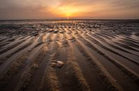 Een zonsondergang op de Noordsvaarder van Terschelling. Het was net vloed geweest en de stromingen en water hebben voor mooie lijnen ion het zand gezorgd. Er is een schelpje blijven liggen wat mooi als voorgrond werkt voor de foto. Terwijl de zon bijna onder gaat.