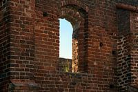 leeg raam met een plukje gras in een stenen muur van de kloosterruïne in Bad Doberan, Noord-Duitsland, kopieerruimte