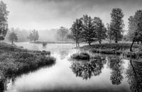 Gekozen voor een zware wit opname, De lijnen , de reflectie van de bomen in het water en de mystiek door de mist maken het beeld voor mij compleet