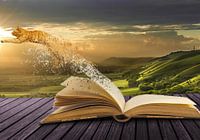 De foto toont een digitaal gecreëerde fotovervreemding die een poëtisch tafereel vastlegt. In het midden ligt een opengeslagen boek op houten planken. De pagina's van het boek lijken tot leven te komen: Terwijl de ene pagina nog bedekt is met fijn getekende letters, begint de andere pagina op te lossen in fijne deeltjes. Deze…