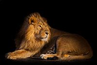 leeuw op een zwarte achtergrond. krachtig knap leeuwenmannetje met prachtig haar ligt op de grond en kijkt. geel avondlicht.