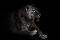 een leeuwin in het maanlicht kijkt dromerig vooruit met een heldere blik in de nachtelijke duisternis. Krachtig mooi beest.