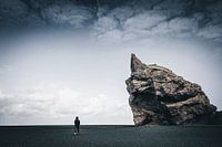 Die dag waren we in de buurt van Vik op een heel uitgestrekt strand. Mijn vrouw wilde de rots in de verte van dichtbij bekijken. Ik kon het niet laten om op de grond te gaan zitten en het tafereel vast te leggen. Het is somber maar tegelijkertijd ook aantrekkelijk. Je zou haast denken dat het een scène uit een eindtijdfilm is.