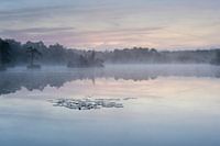 Tijdens de nazomer een schitterend landschap bij de vennen en een mist die over het water zweeft. Een mooi spiegelbeeld op het water van de wolken en bomen in het landschap.