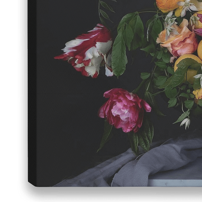 bloemstuk / stilleven met een knipoog naar de 17e eeuw. kleuren en overdaad met een donkere achtergrond.