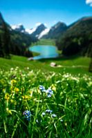 voorjaarsuitzicht met een stralend uitzicht op de bloem en het Sämtiser meer in de ruige Appenzeller Alpen