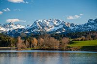 lenteachtig uitzicht vanaf de Schwaltenweiher naar de bergen
