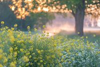 close up van gele wilde lentebloemen, met op de achtergrond een prachtige zonsopkomst met nevel over het land